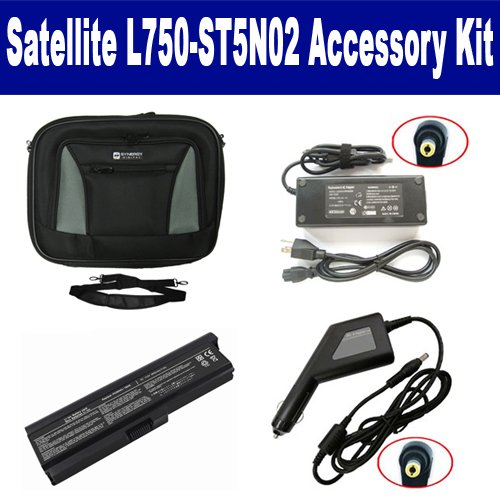 Toshiba Satellite L750-ST5N02 Laptop Accessory Kit includes the following items: 1) SDC-34 Laptop 16" Black Case Soft Inner Material With Extra Pocket 2) SDB-3354 Laptop Battery - Lithium-Ion - Ultra High Capacity Rechargeable (6 Cell - 4400 mAh - 49wh - 11.1 Volt) Replacement for Toshiba PA3818U Laptop Battery 3) SDA-3507 Laptop Adapter (19 Volt, 3.95 Amp, 75 Watt) 4) SDA-3557 Laptop DC Adapter / Car Charger (19 Volt, 3.95 Amp, 75 Watt)